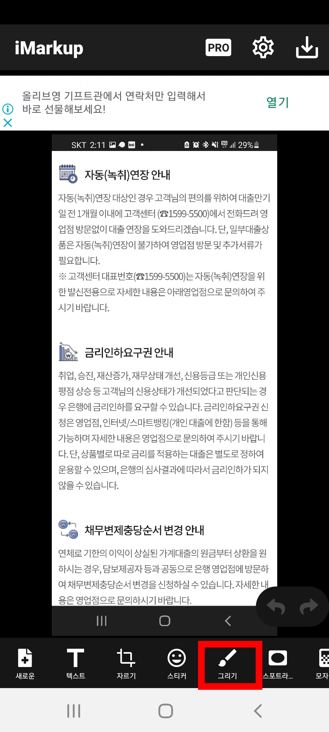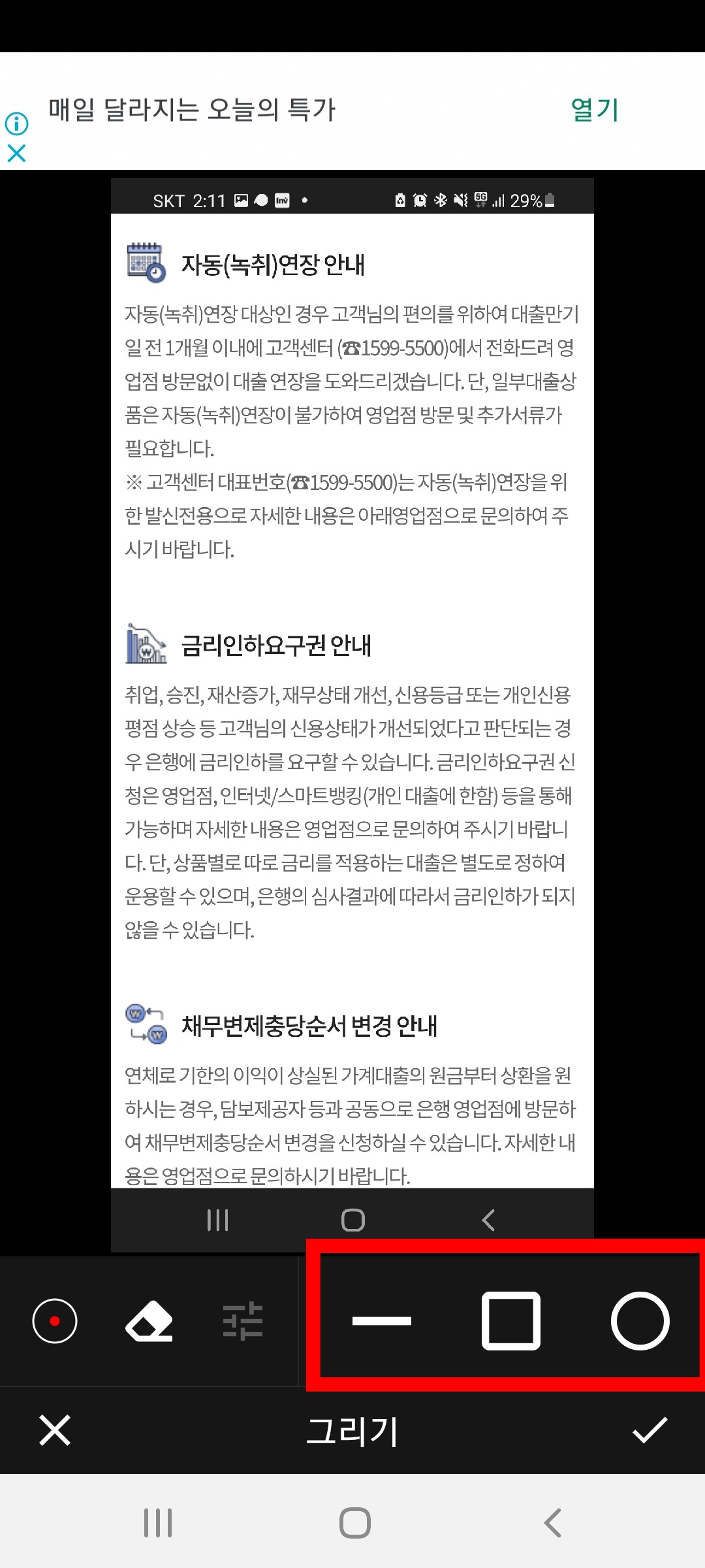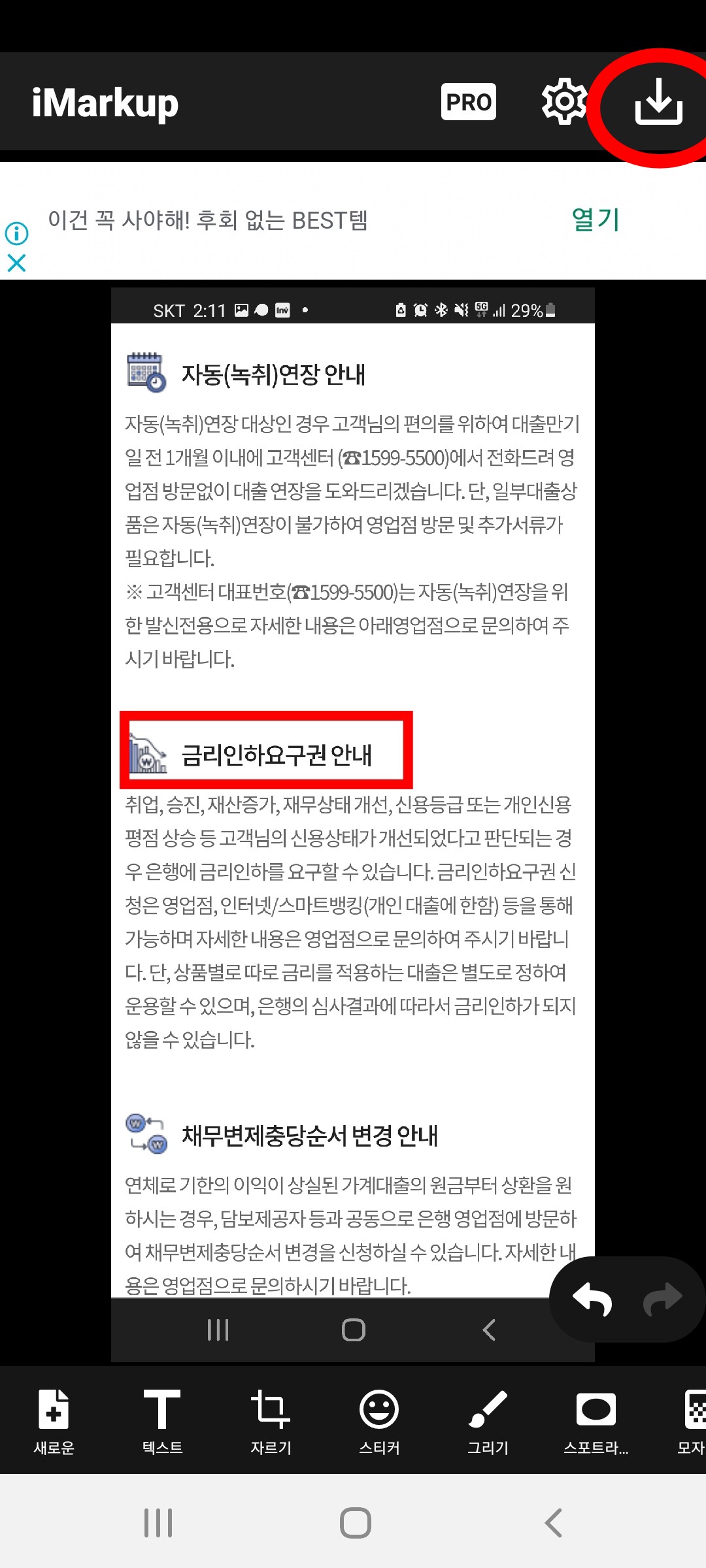 일부러 텍스트가 많은 화면을 예시로 해보았습니다. 저도 요즘 정보성 포스팅을 많이 하는데 이렇게 이미지에 박스를 치거나 줄을 긋고싶은 경우가 많습니다. 아이마크업 어플로 간단하게 적용했고, 이제 저장만 하시면 됩니다.