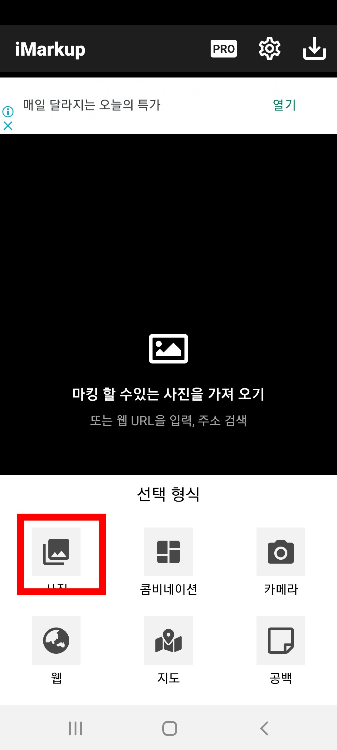 초기화면에서 까만 바탕화면의 '마킹할 수 있는 사진을 가져오기' 글자 영역을 터치하면 사진첩이 열립니다.